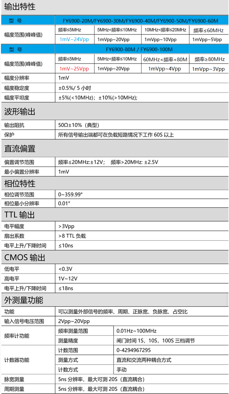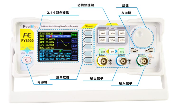 FY6900系列雙通道函數/任意波形發生器是一款集函數信號發生器、任意波形發生器、脈沖信號發生器、VCO、掃頻儀、計數器和頻率計等功能于一身的高性能、高性價比、多功能的信號發生器。豐富的快捷鍵極大地簡化了復雜的操作過程,大大地增強了儀器的可操作性。用戶不必花大量的時間去學習和熟悉儀器的操作,即可熟練使用。特別適合電子愛好者、科研院校和高新企業、汽車維修等領域的使用。
