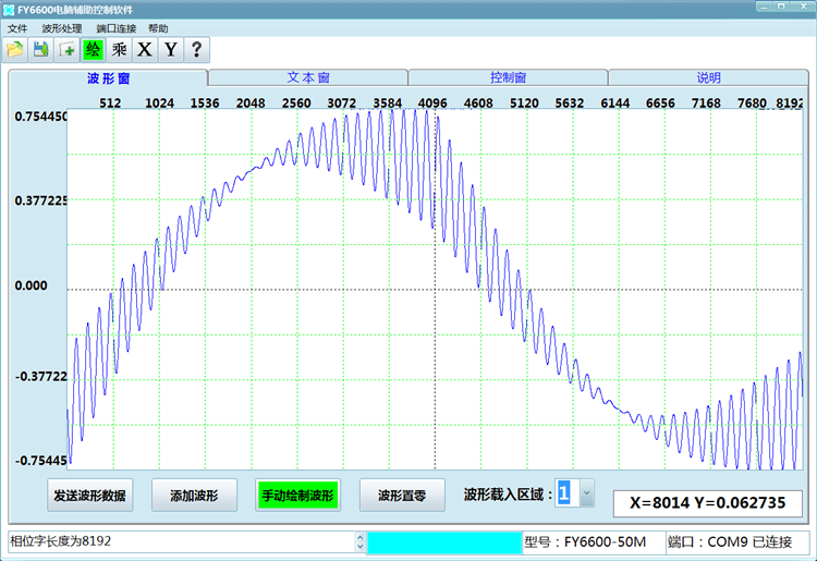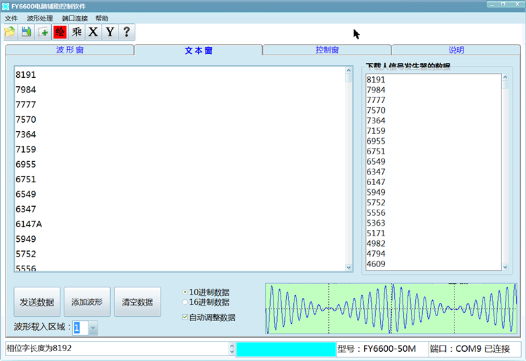 (3)文本窗 FY6900系列信號發生器提供強大的文本窗編輯功能,可將多種格式的任意波形文件自動轉換為儀器所需格式文件,可以手動修改或者編輯波形文件數據,并且通過右下角波形窗口可以實時觀察到波形相應的變化。