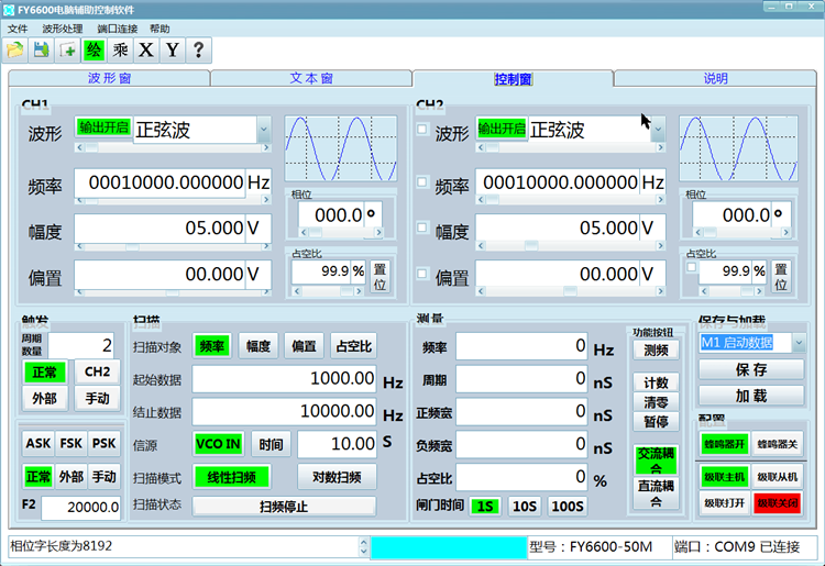 FY6900系列信號發生器不僅可以獨立使用,而且還可以通過電腦上位機軟件控制,通信協議公開、上位機軟件免費贈送。軟件具有波形窗、文本窗、控制窗三大功能窗口,簡潔明了的操作界面大大提高了用戶操作體驗。