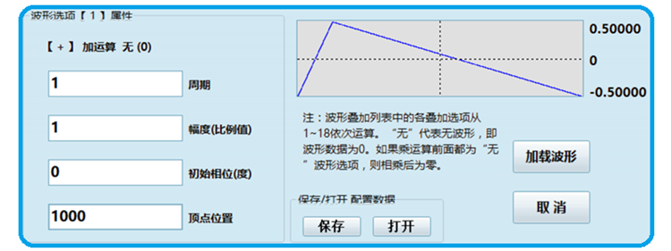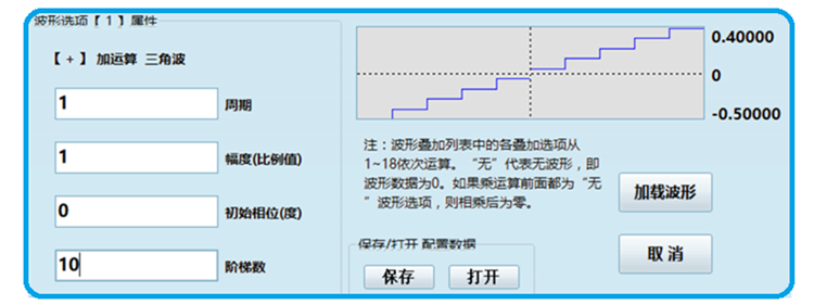 (2)、波形窗 波形窗具有強大的波形編輯功能,可實現18組不同參數波形任意疊加和調制。階梯波階梯個數可編輯、鋸齒波頂點位置可以任意設定。