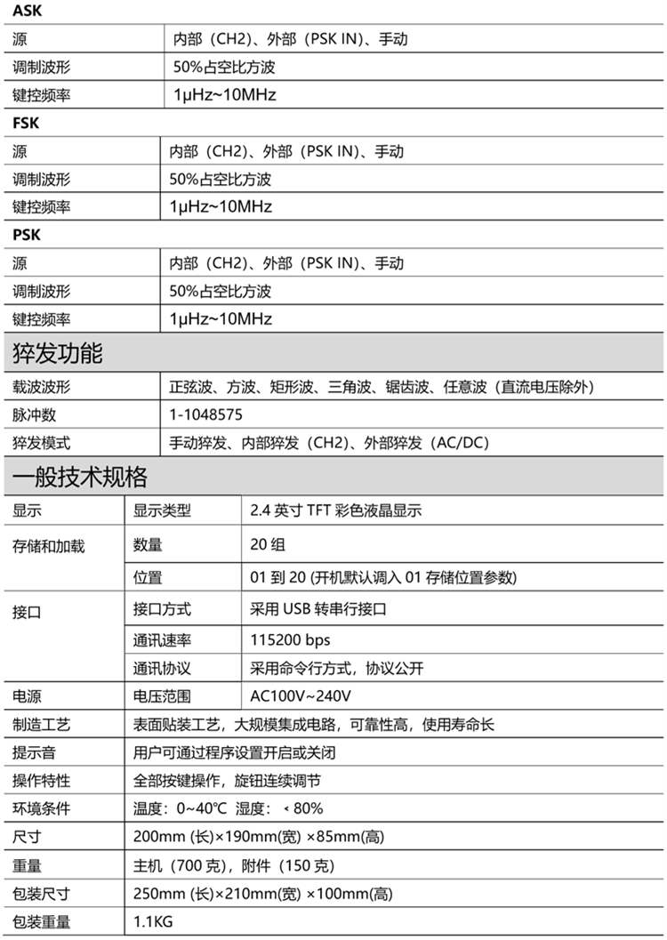 ◆ 豐富的調制類型:AM、FM、PM、ASK、FSK和PSK調制;