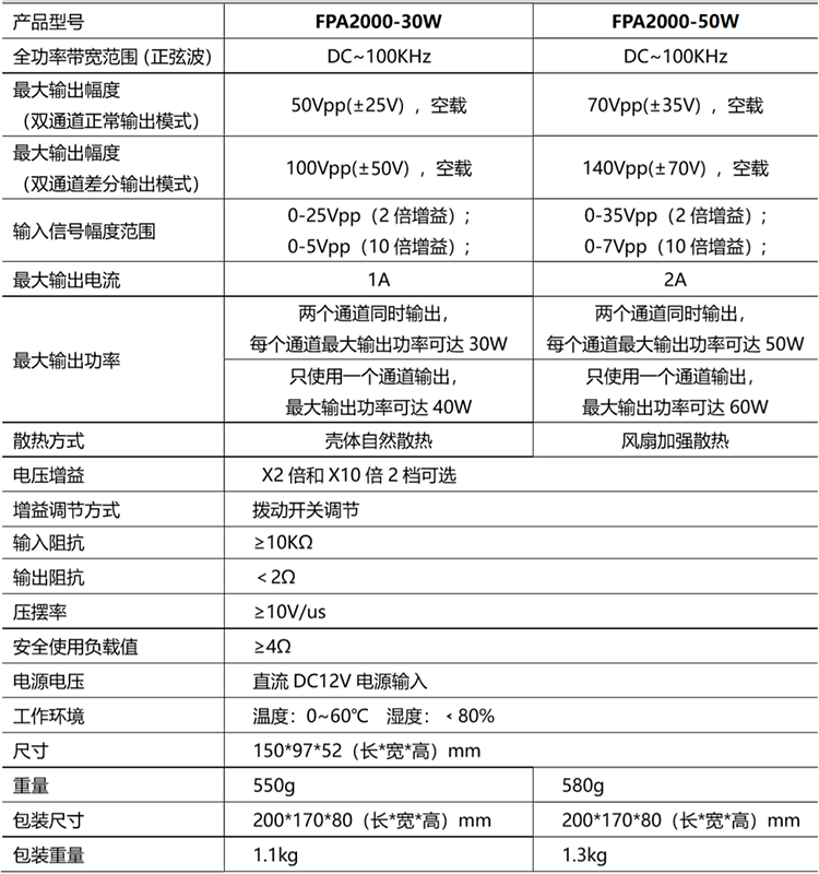 FPA2000-50W在雙通道輸出模式下,每個通道最大輸出功率都可以達到50W,最高輸出幅度65Vpp(正負32.5V),最大輸出電流2A;FPA2000-50W單通道輸出模式下,最大輸出功率可達60W;